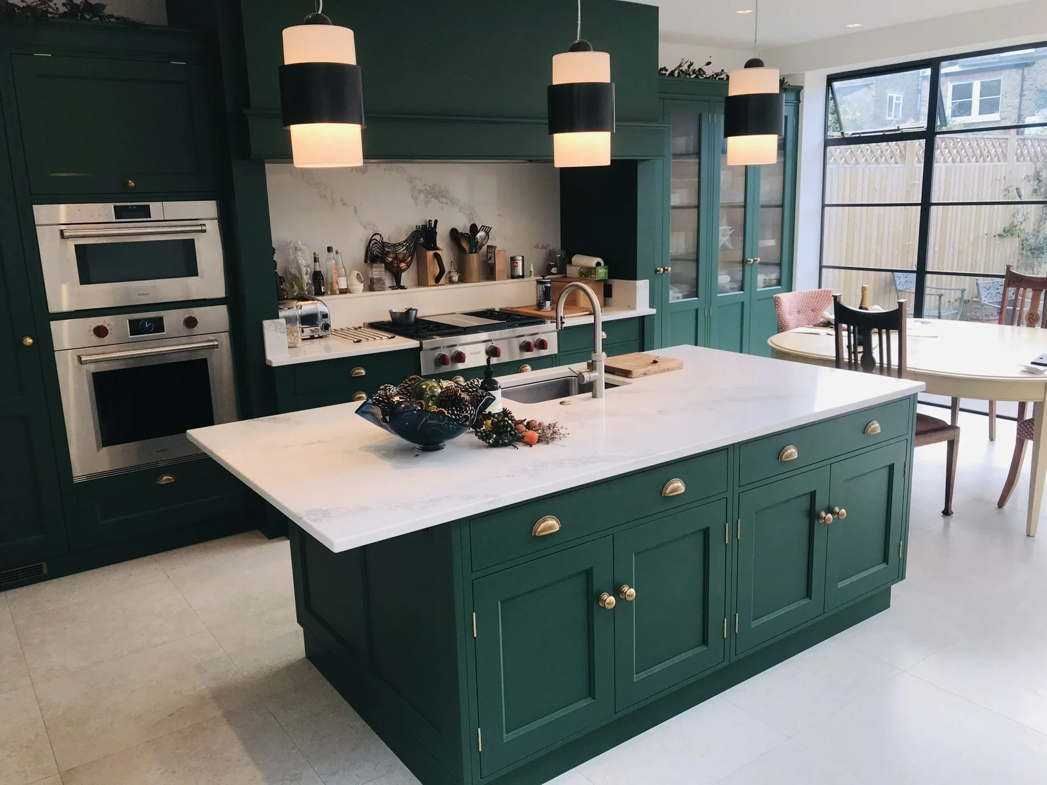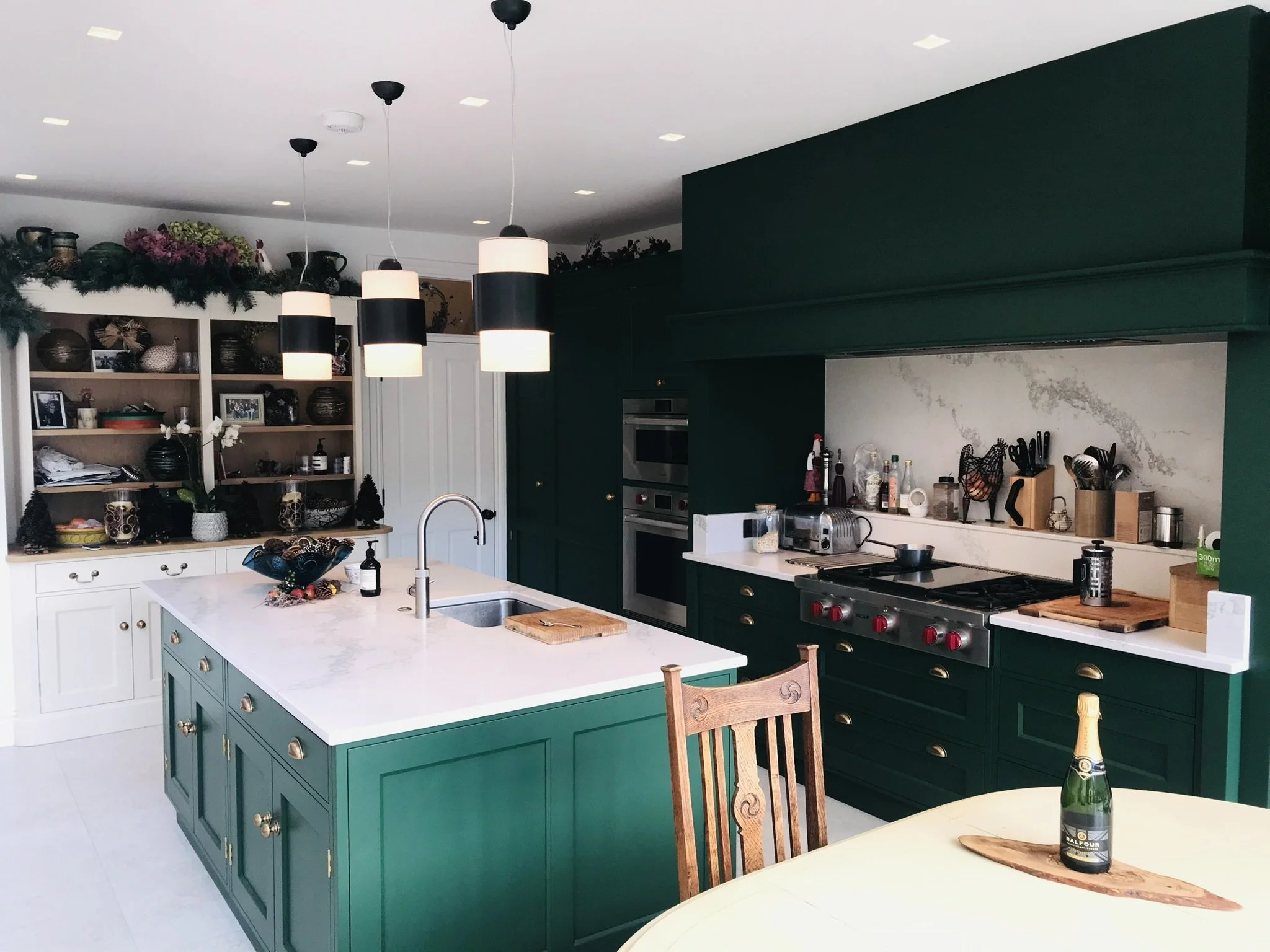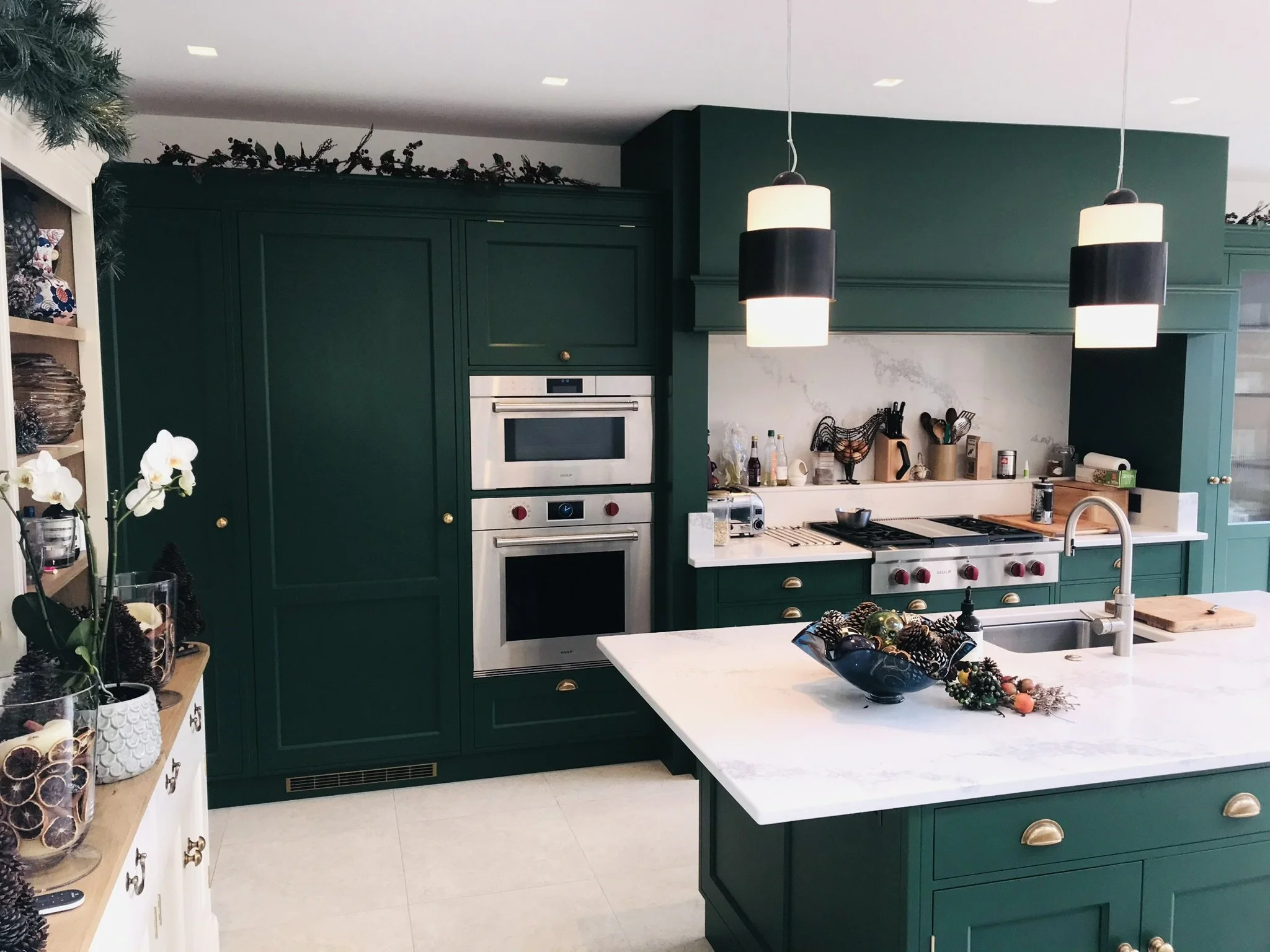 Rooted in traditional design, this elegant kitchen features deep forest green cabinetry paired with brushed brass hardware and a marble-effect worktop, creating a look that’s both refined and inviting. A generous island with an under-mounted sink anchors the space as a social and practical hub, while a range-style hob complete with marble shelf and splash-back adding heritage character.