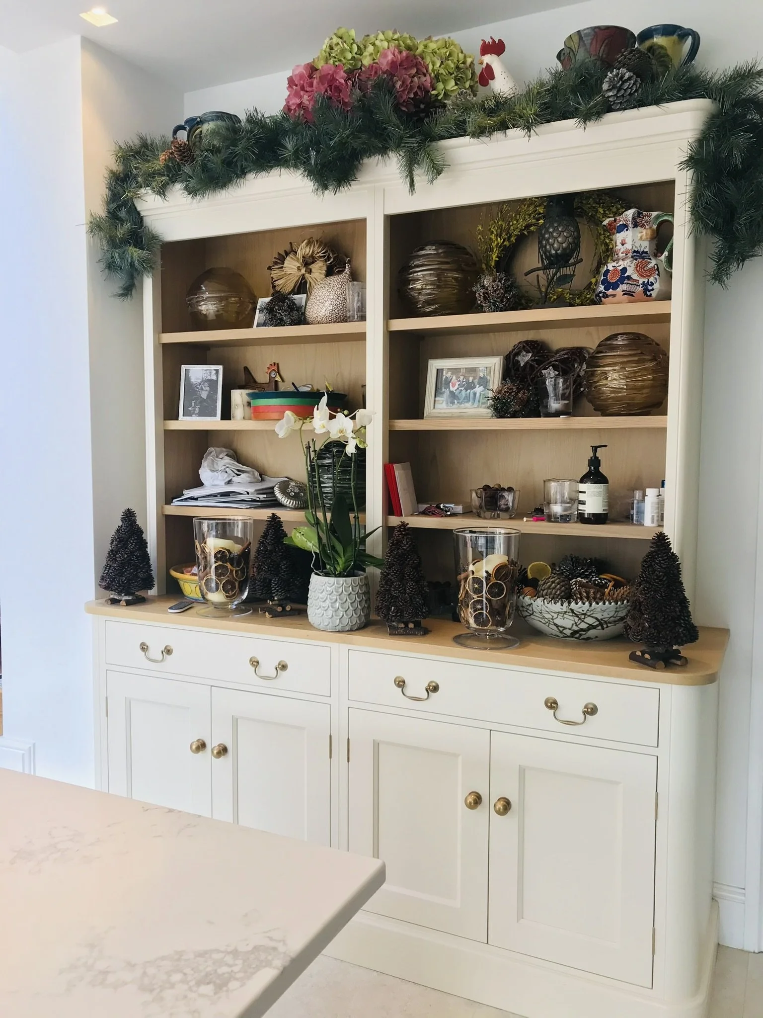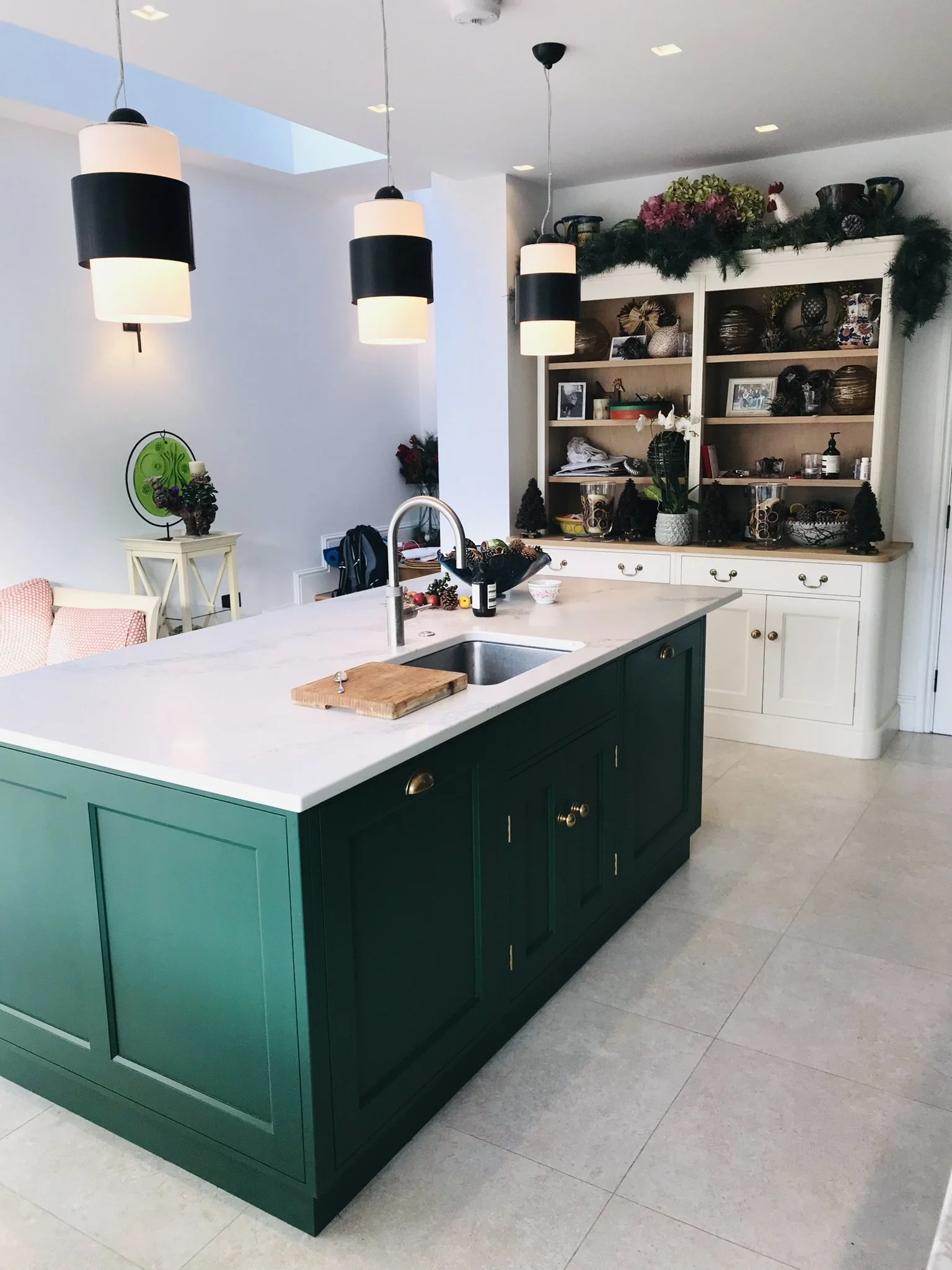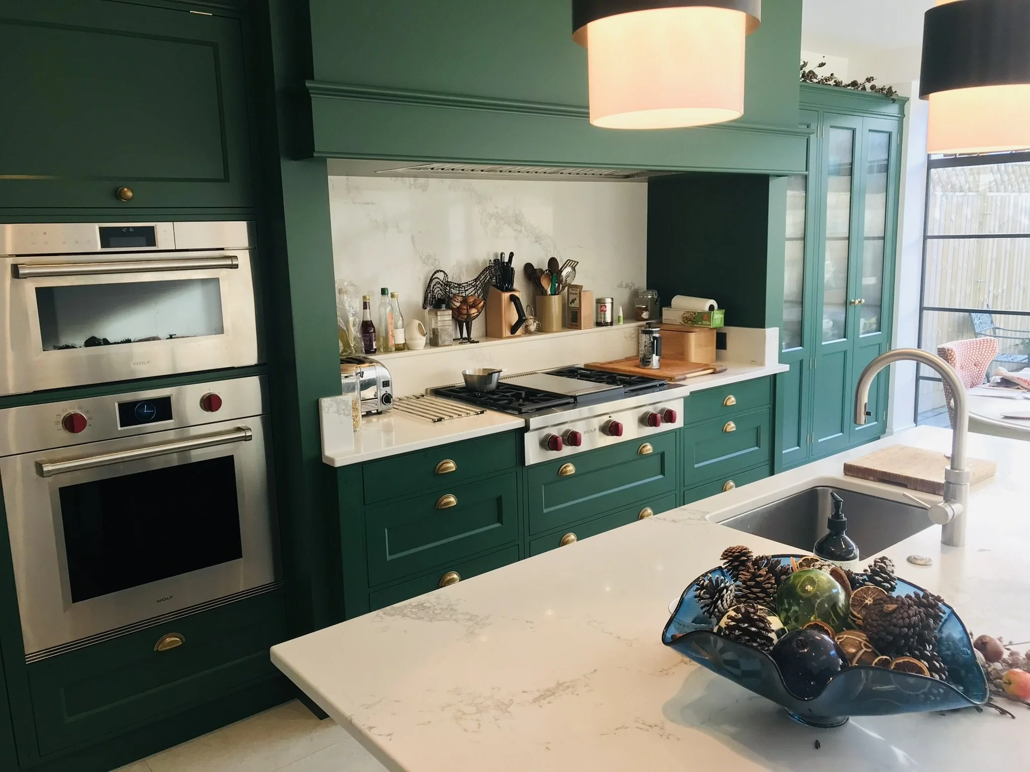 Rooted in traditional design, this elegant kitchen features deep forest green cabinetry paired with brushed brass hardware and a marble-effect worktop, creating a look that’s both refined and inviting. A generous island with an under-mounted sink anchors the space as a social and practical hub, while a range-style hob complete with marble shelf and splash-back adding heritage character.