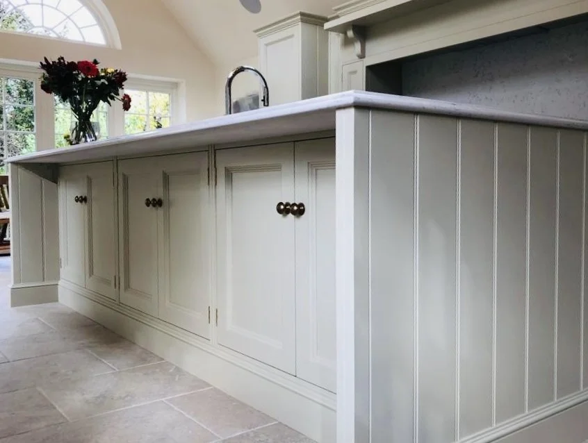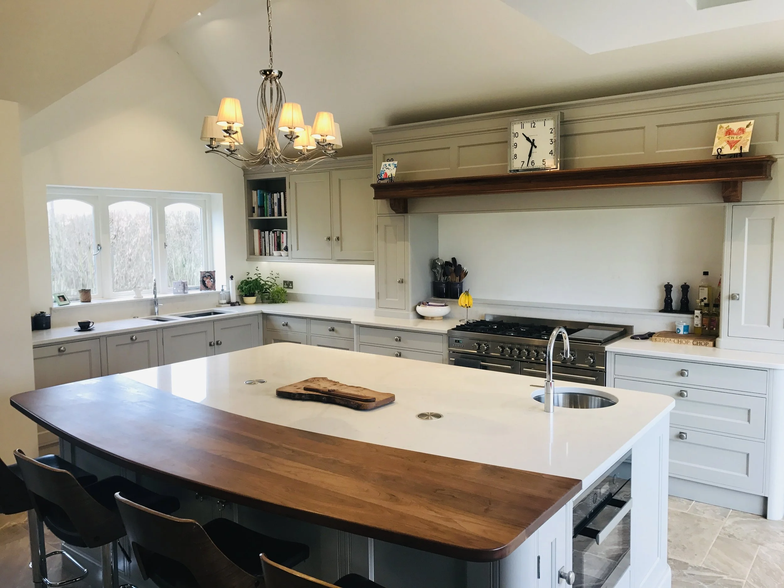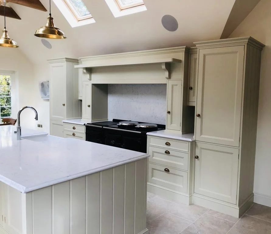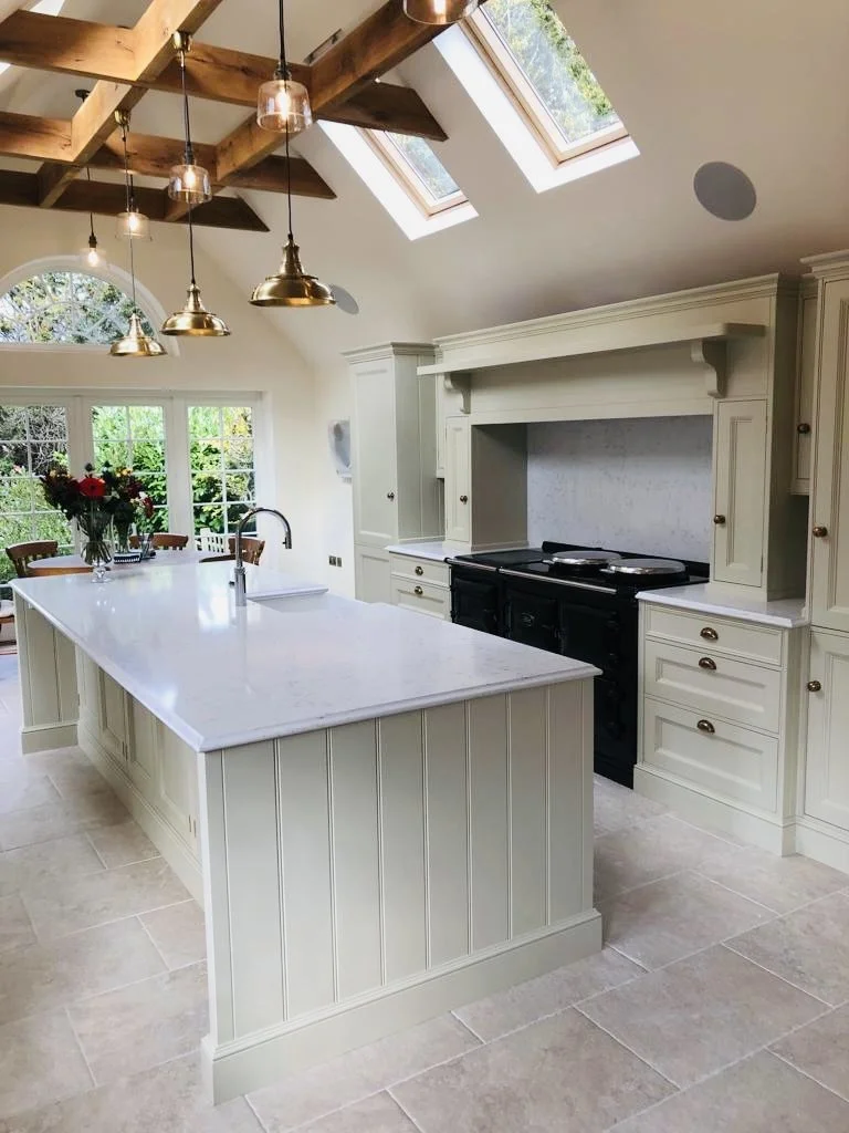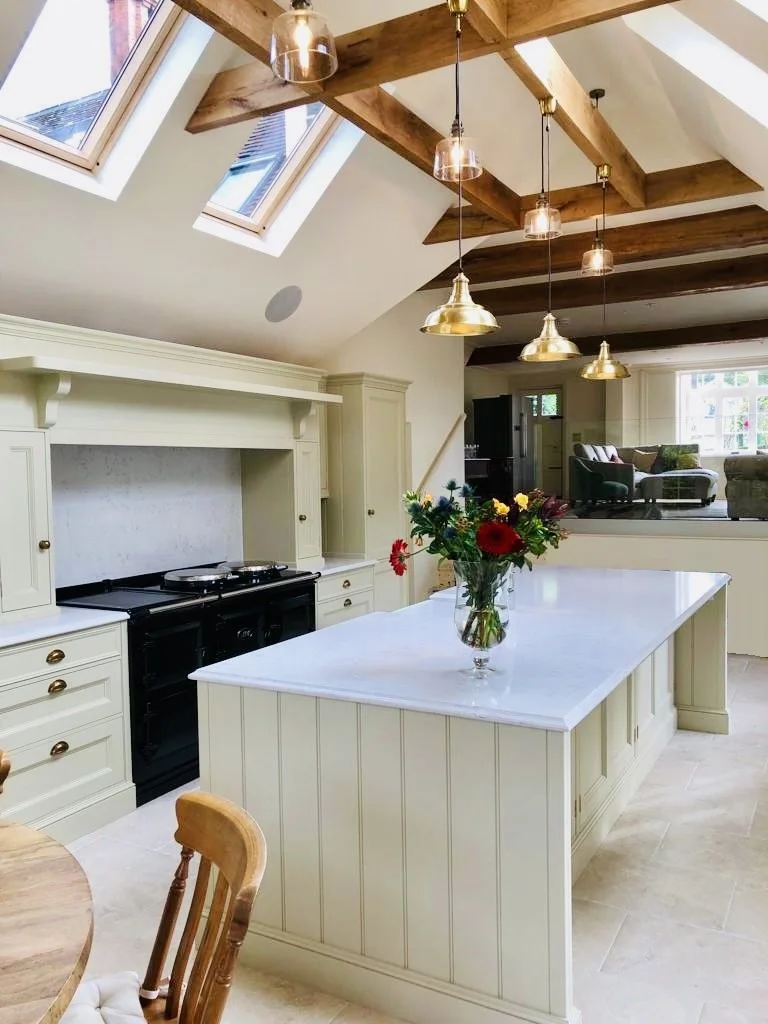 Framed by soaring ceilings and exposed oak beams, this serene kitchen blends heritage detailing with a bright, open layout. Traditional cabinetry in a soft, muted green creates a calming backdrop, while a classic AGA and tongue-and-groove island bring warmth and depth to the space.