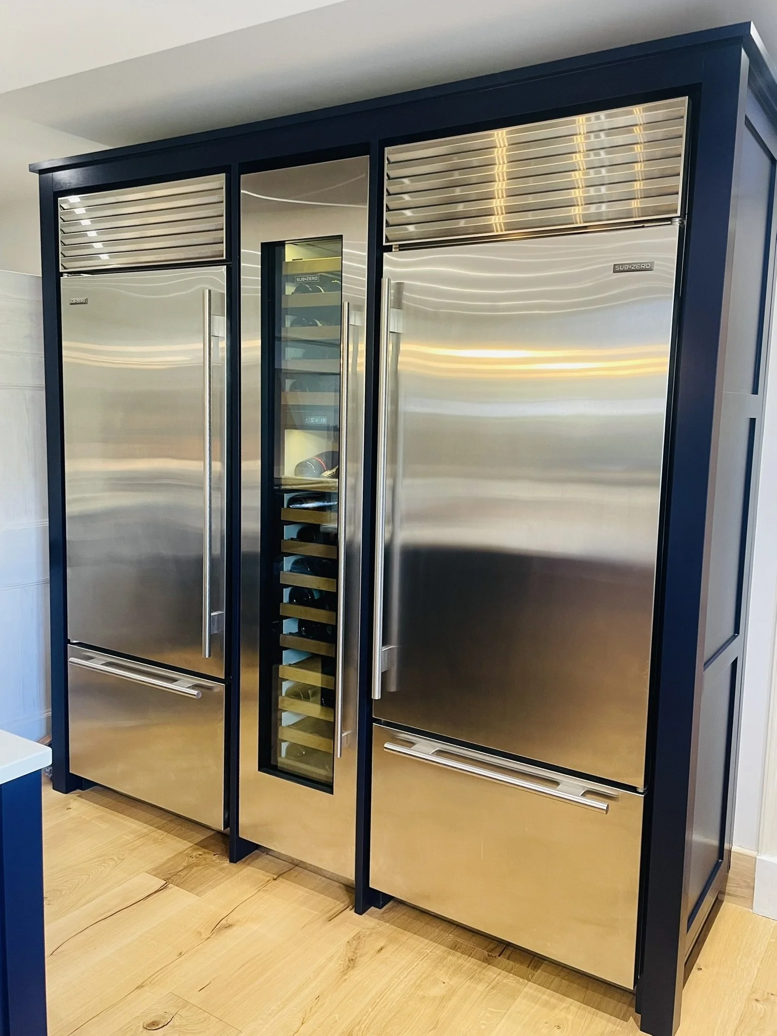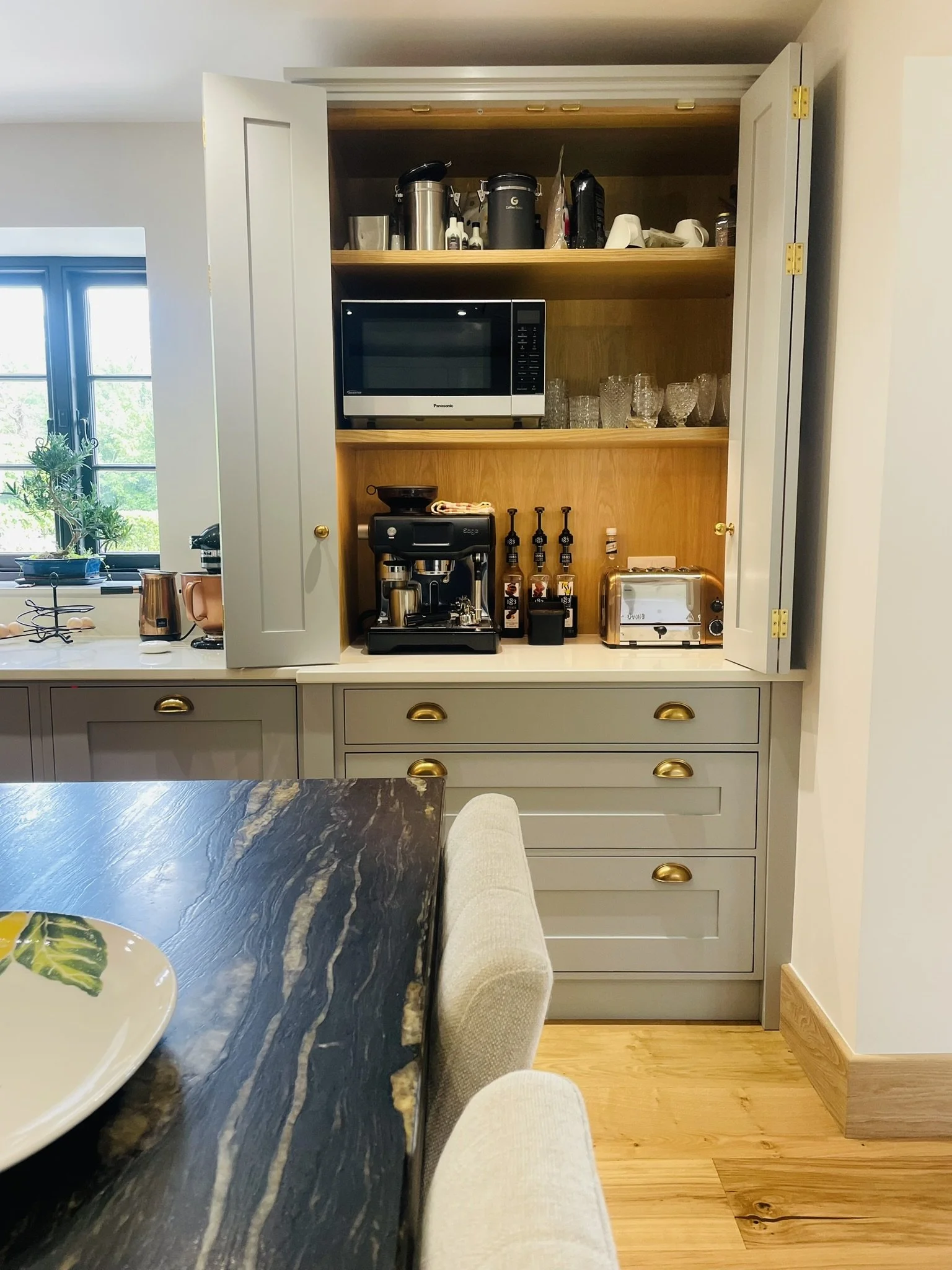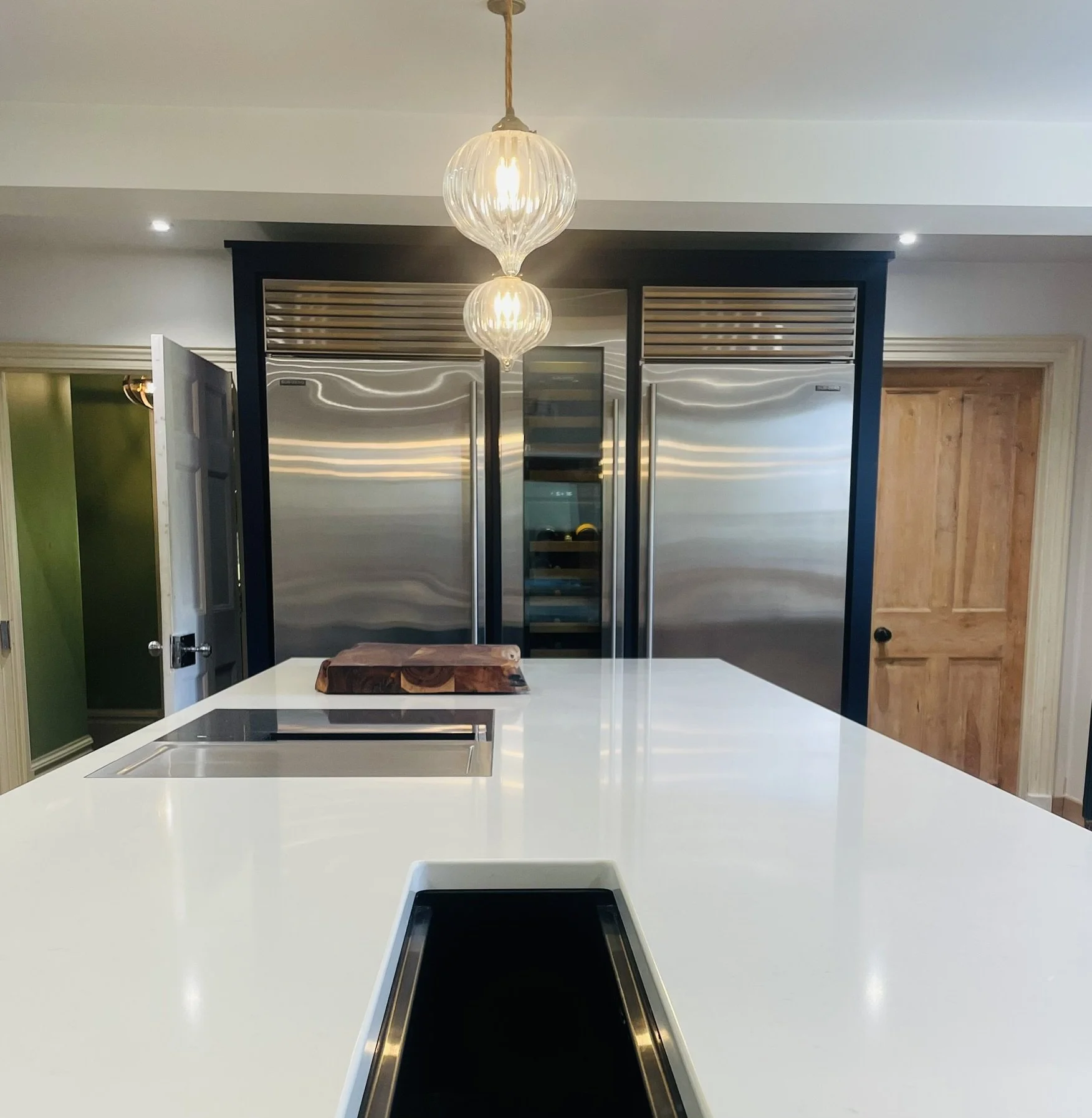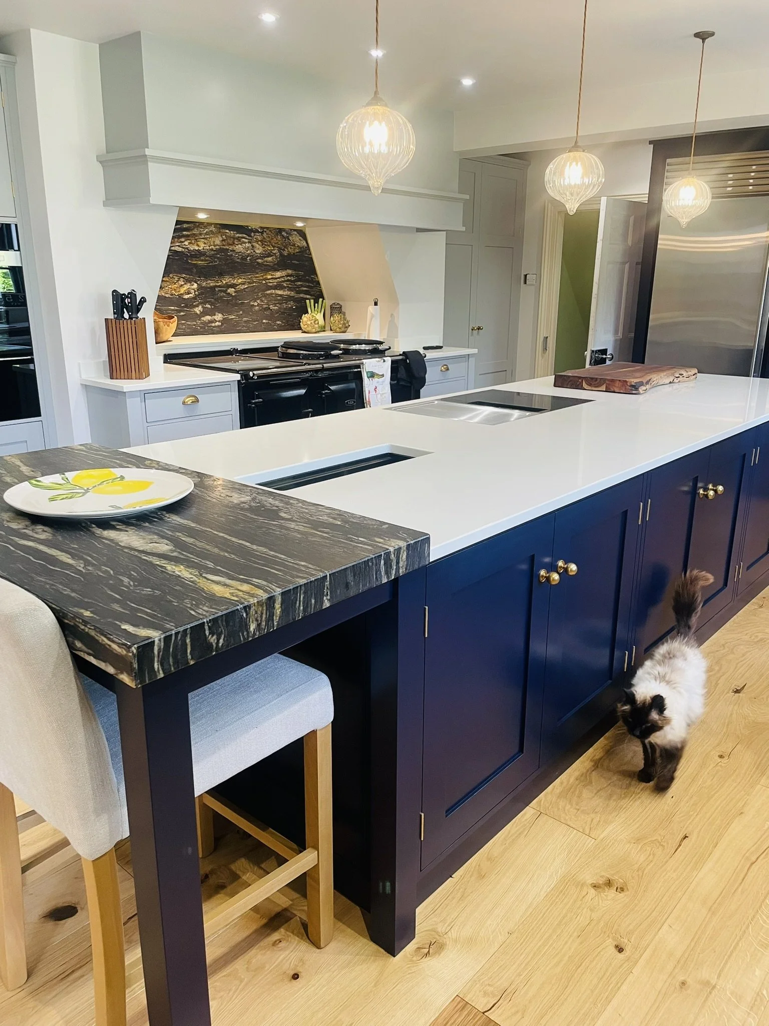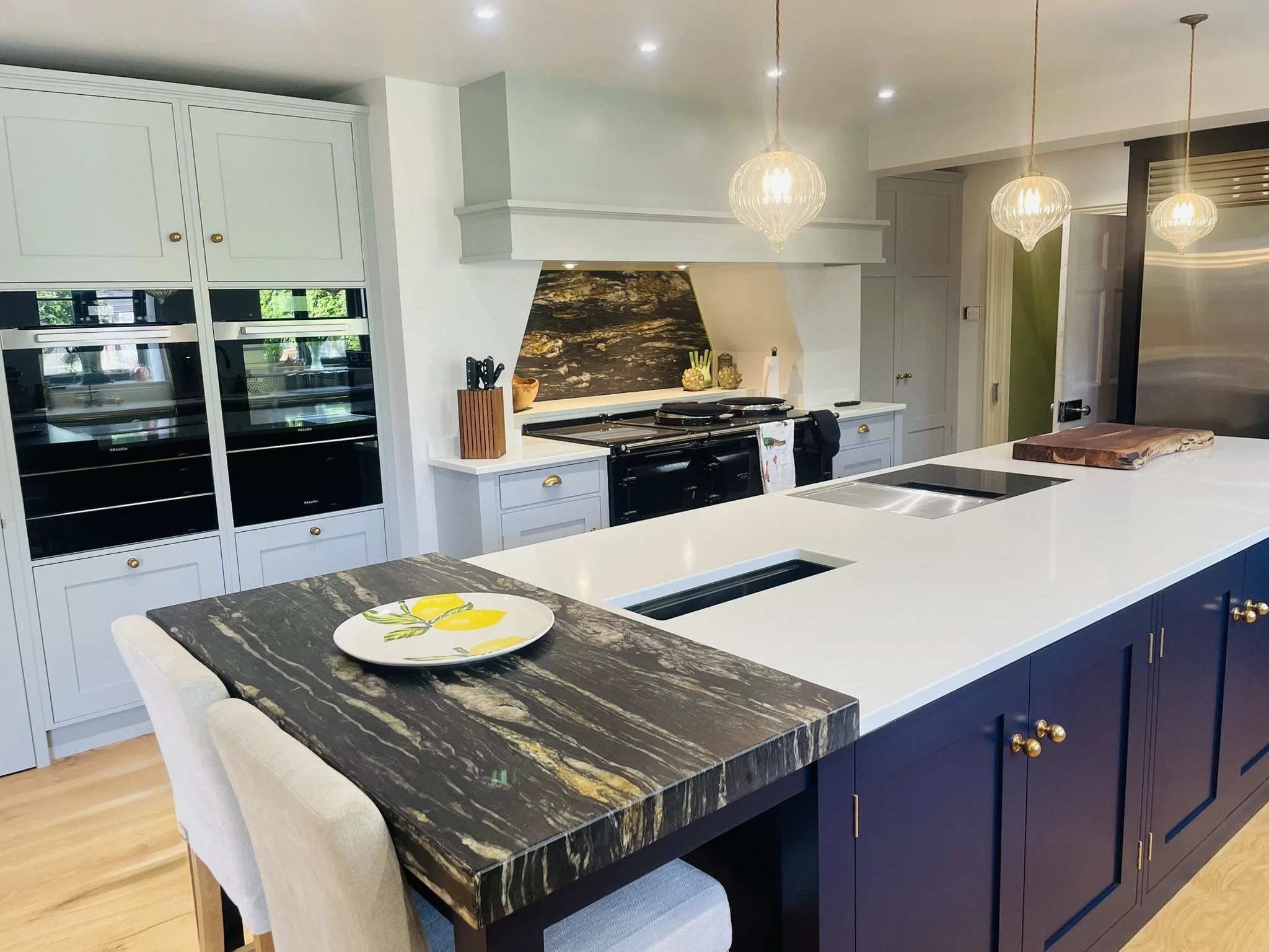 At the centre, a statement kitchen anchors the design with deep navy cabinetry, luxurious river washed stone accents and sculptural glass pendants are surrounded by pale grey units, a striking matching stone splashback, and brass details combine to make this a home that’s as practical as it is poised.