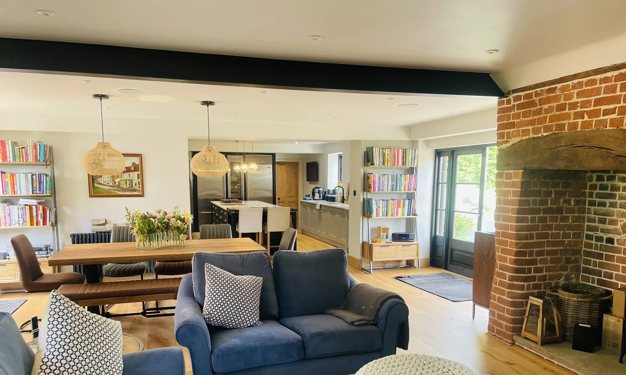 This expansive open-plan space weaves rustic charm and contemporary elegance into one cohesive whole. A rich mix of textures—exposed brick, soft furnishings, and layered lighting—creates a warm, sociable atmosphere that flows effortlessly from living to dining to kitchen. Bookshelves, relaxed seating, and natural accents bring personality and purpose to every corner.