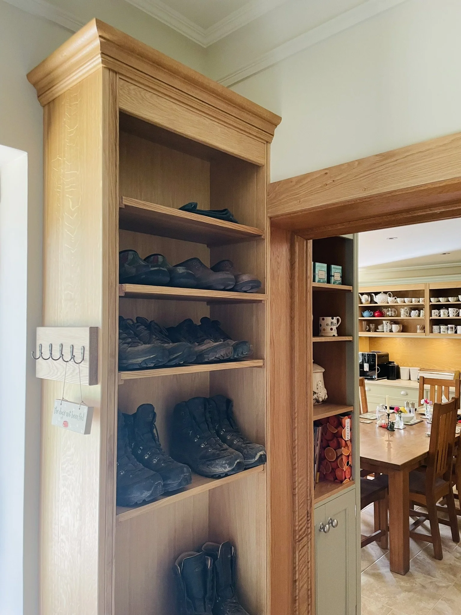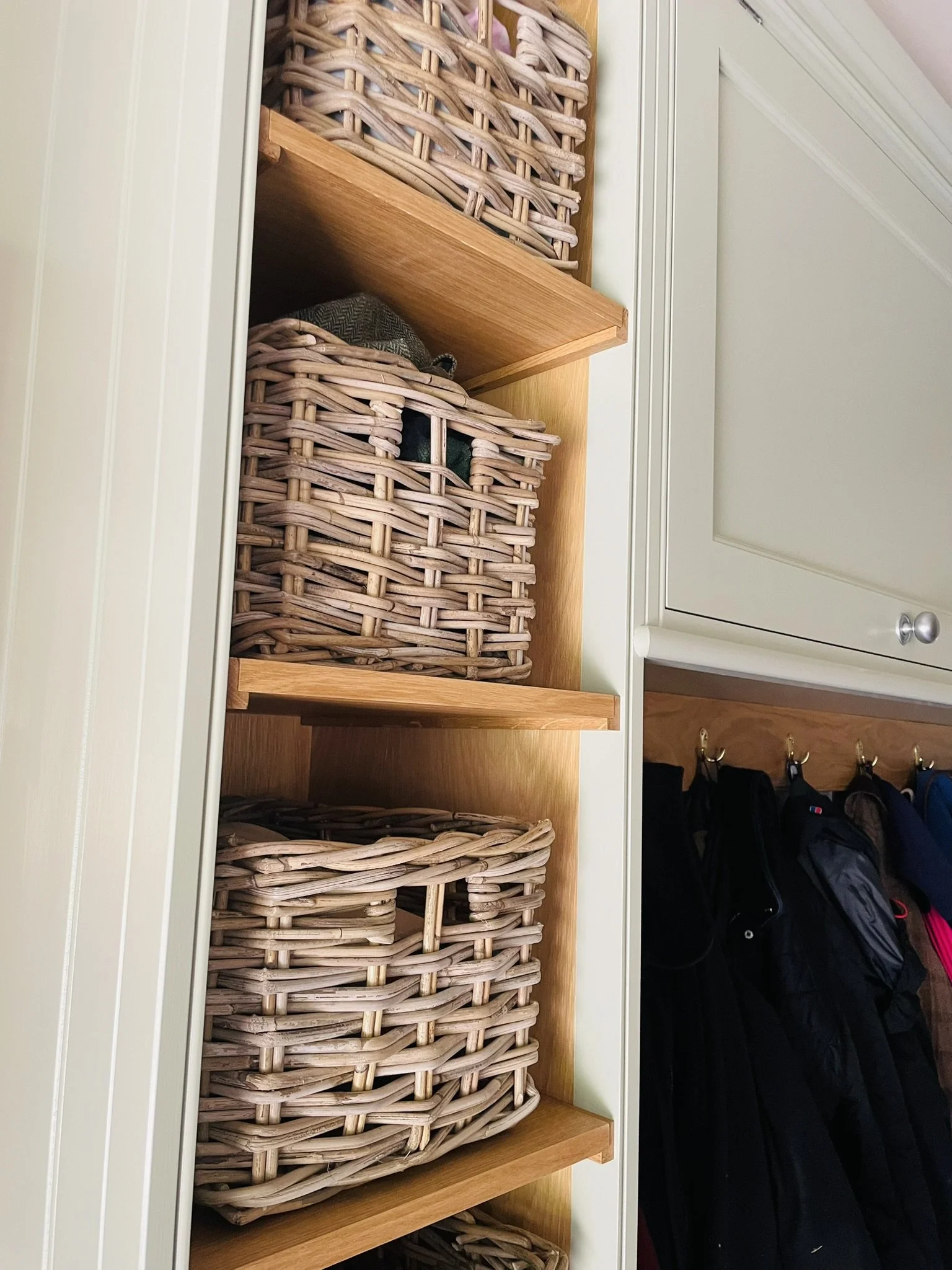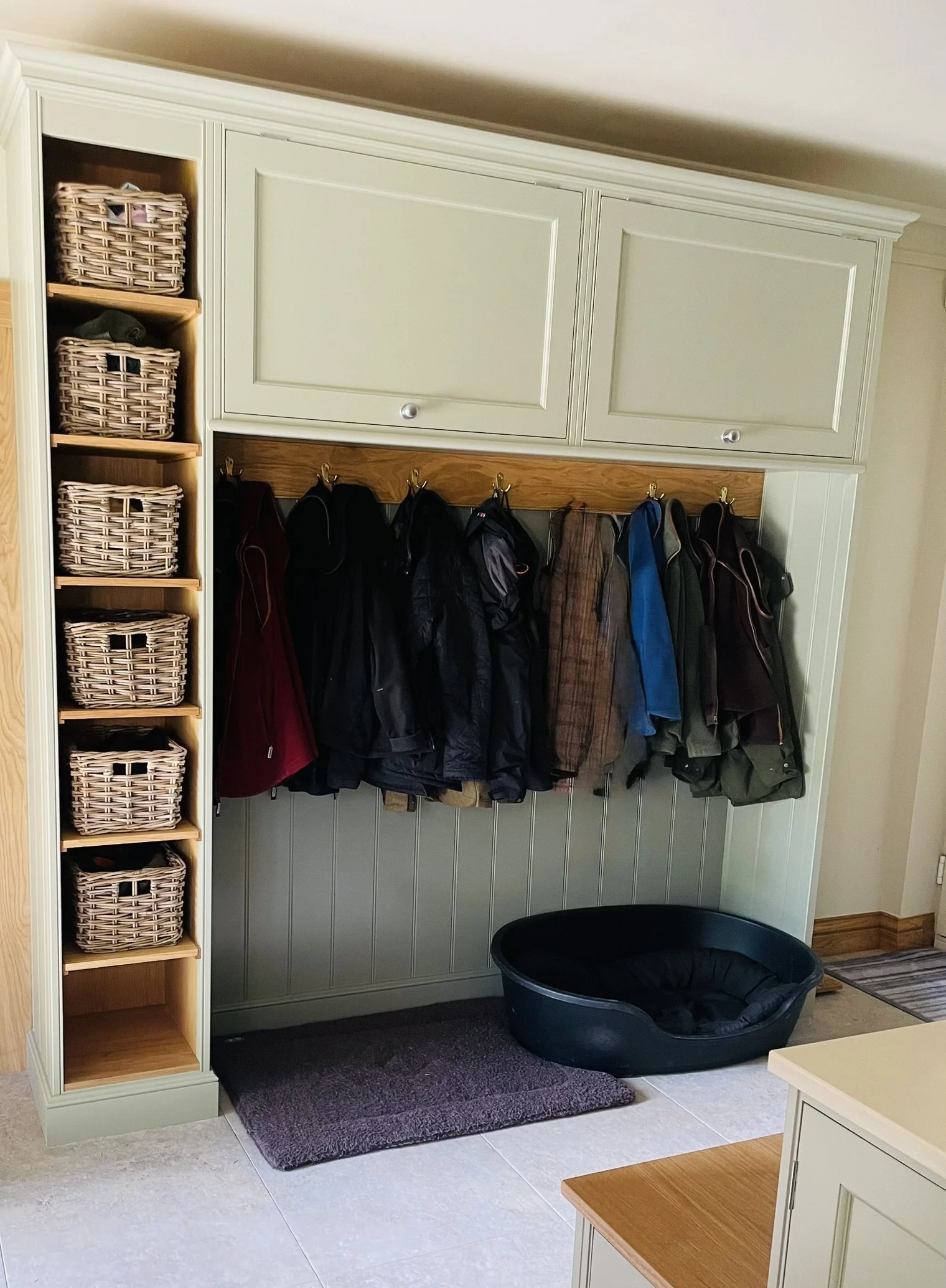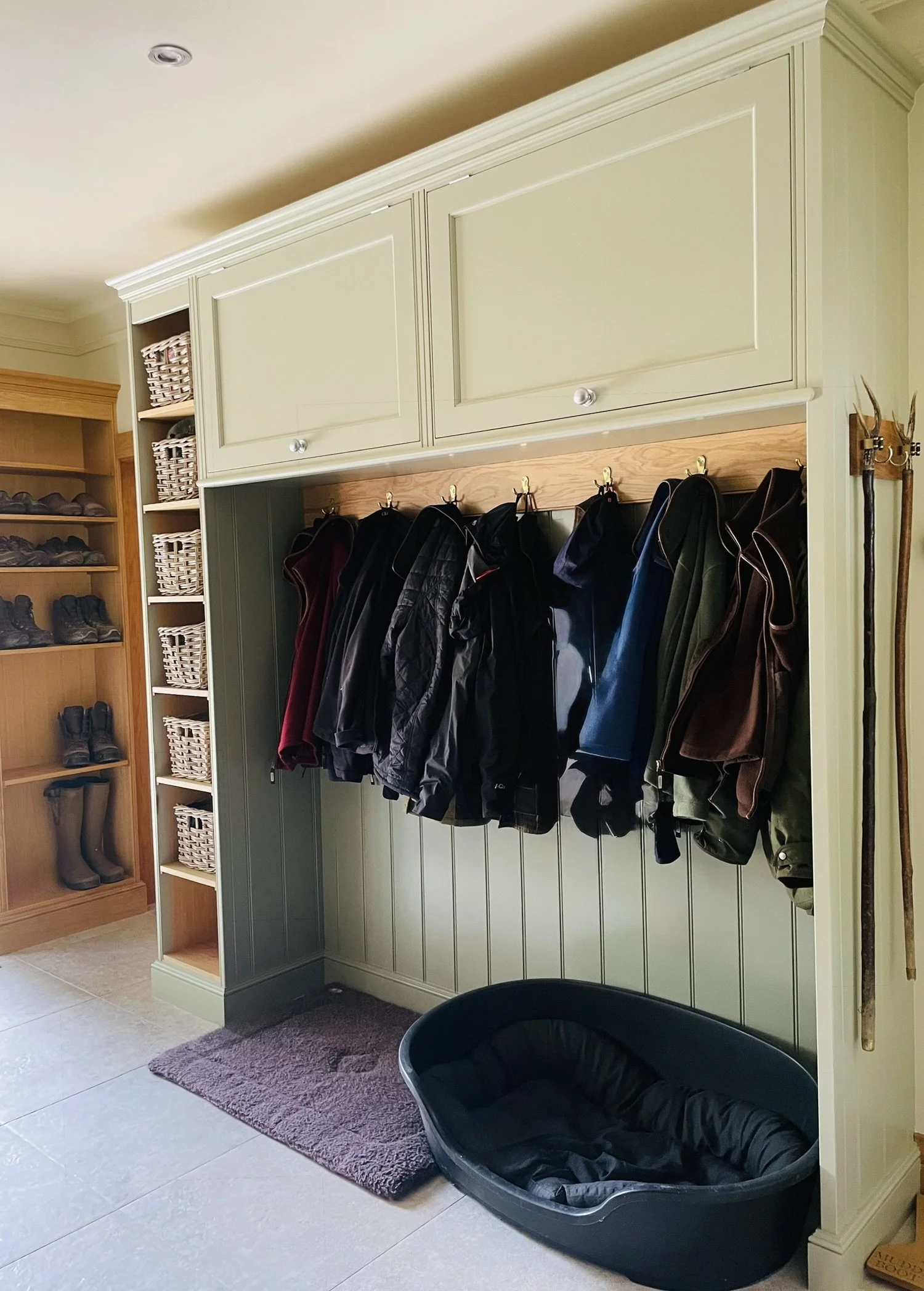 This charming boot room blends traditional design with everyday practicality, perfect for a busy household. Painted cabinetry in a soft sage green is paired with natural wood accents, creating a warm, country-style atmosphere. Ample hanging space, integrated wicker basket shelving, and dedicated boot storage ensure the space stays organised and clutter-free, while thoughtful details like leash hooks and a built-in dog bed show this room was designed with every family member in mind.