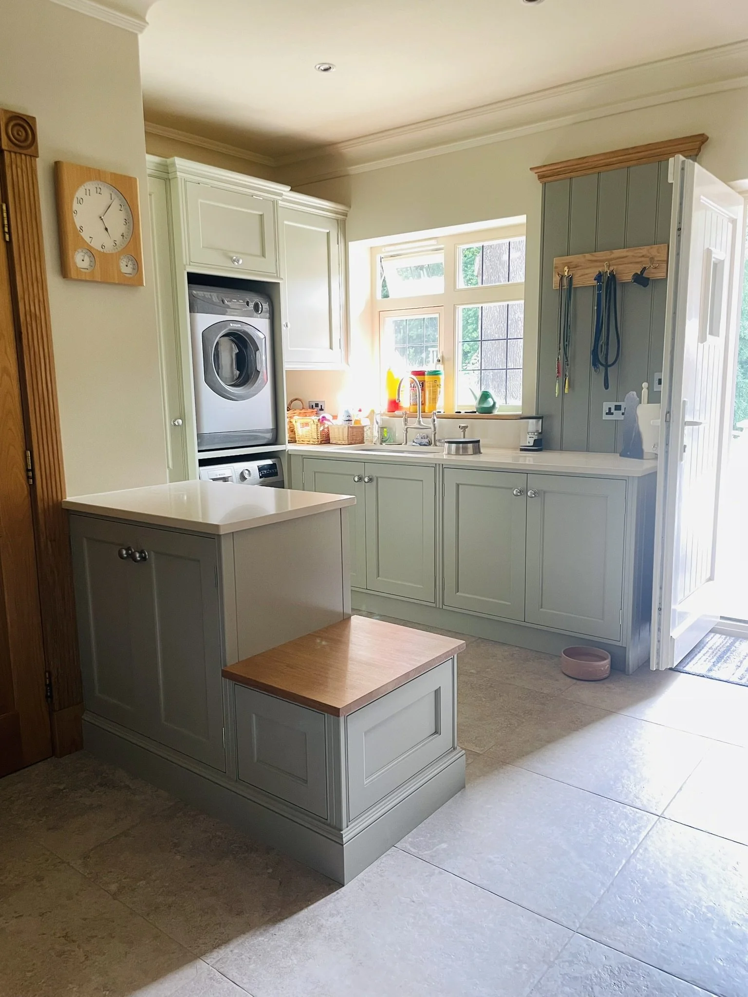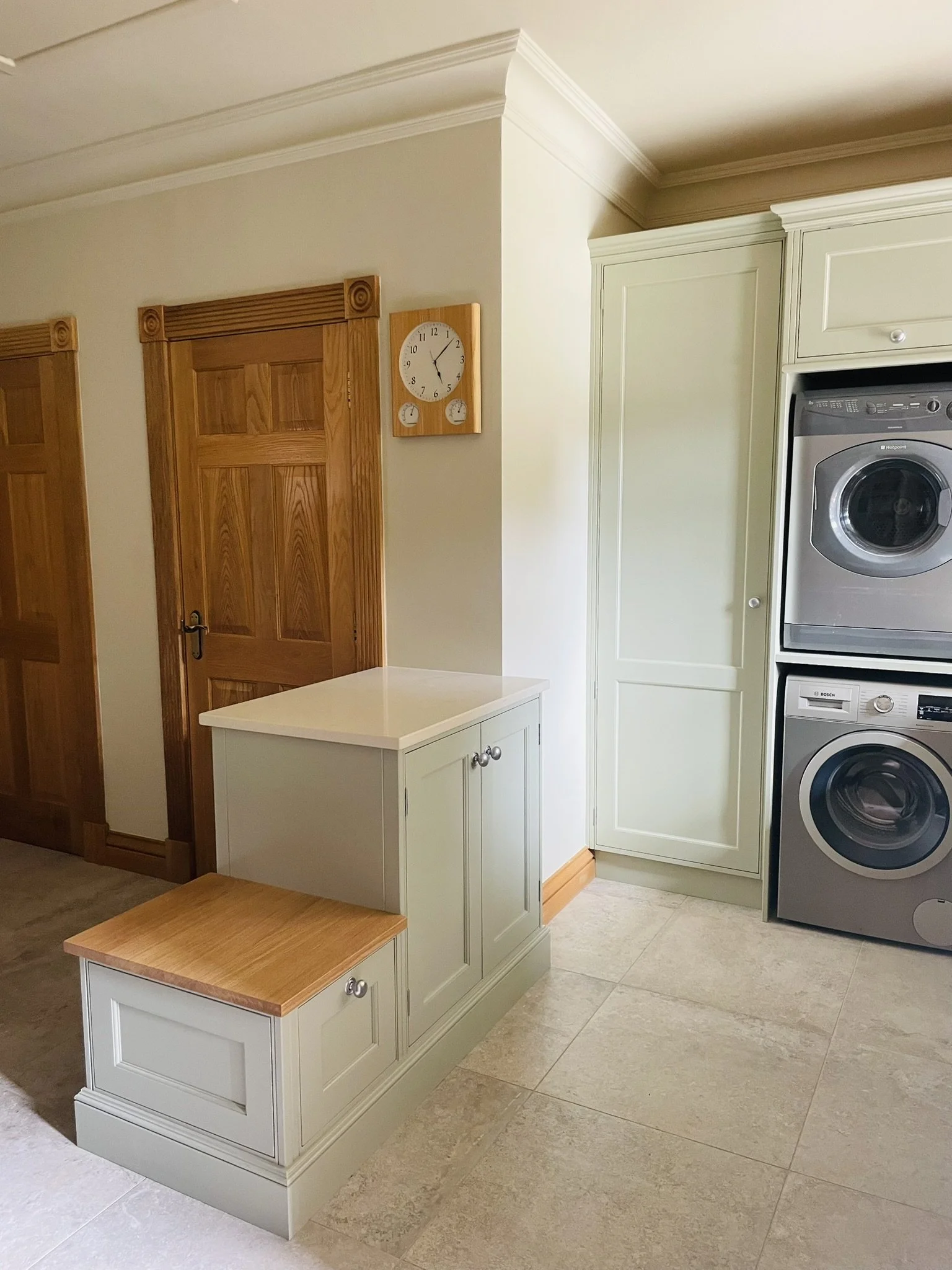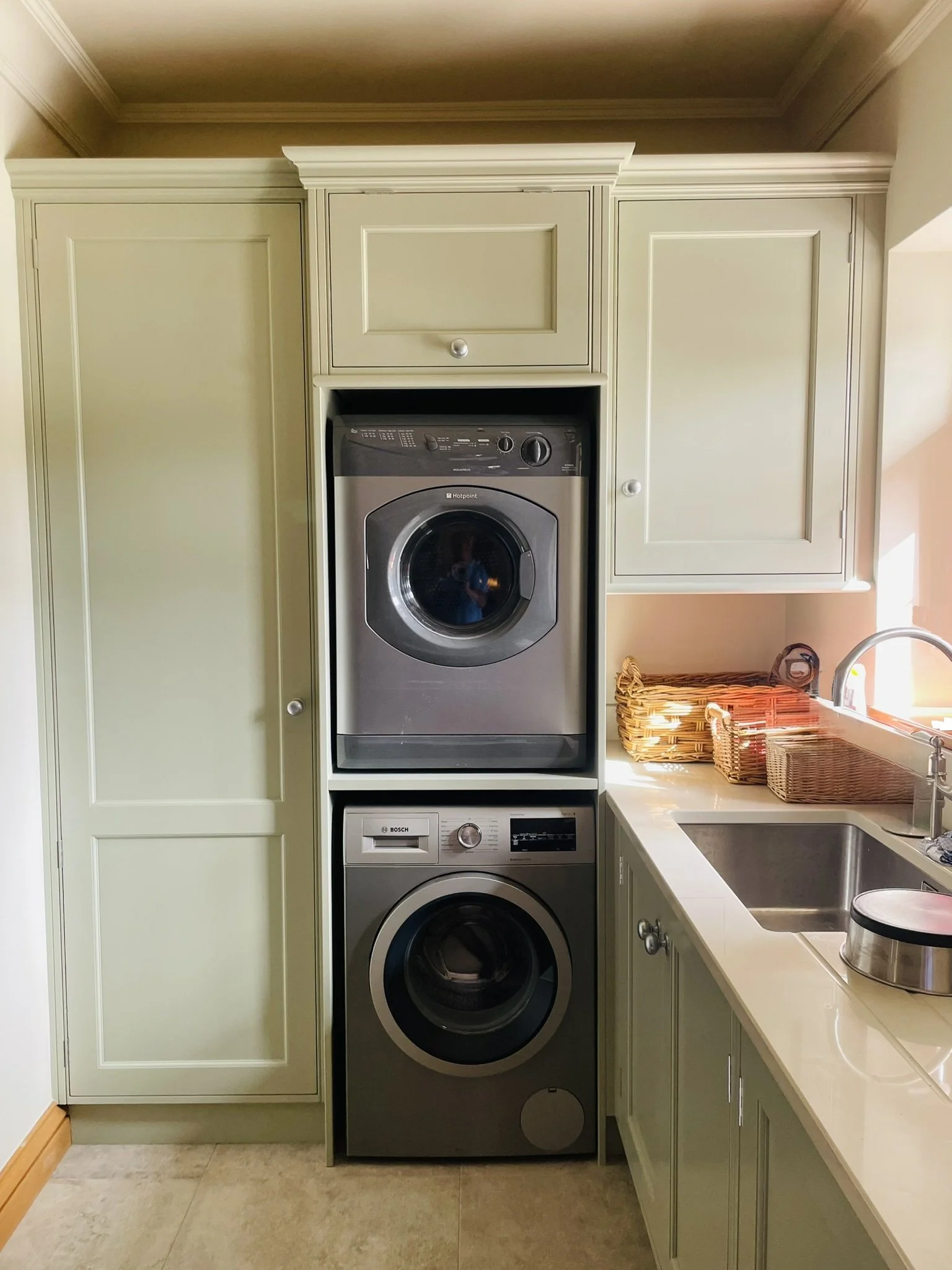 On the utility side, stacked washer and dryer units are seamlessly built into tall cabinetry for a sleek and functional finish. A deep sink and solid worktops provide plenty of room for laundry tasks, while closed cabinets and wicker baskets keep essentials neatly tucked away. This room is a perfect example of how practical spaces can be beautiful, well-organised, and welcoming.