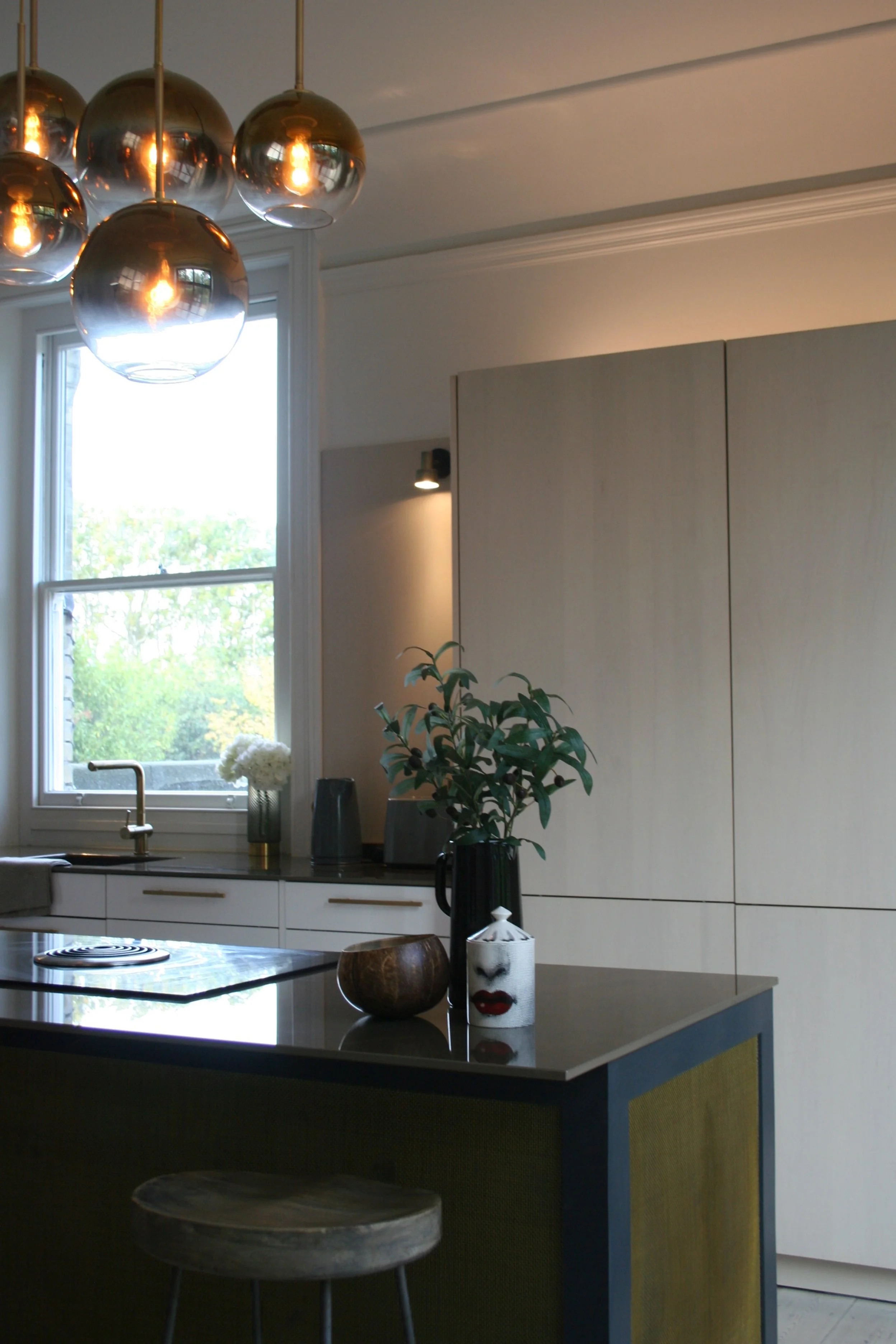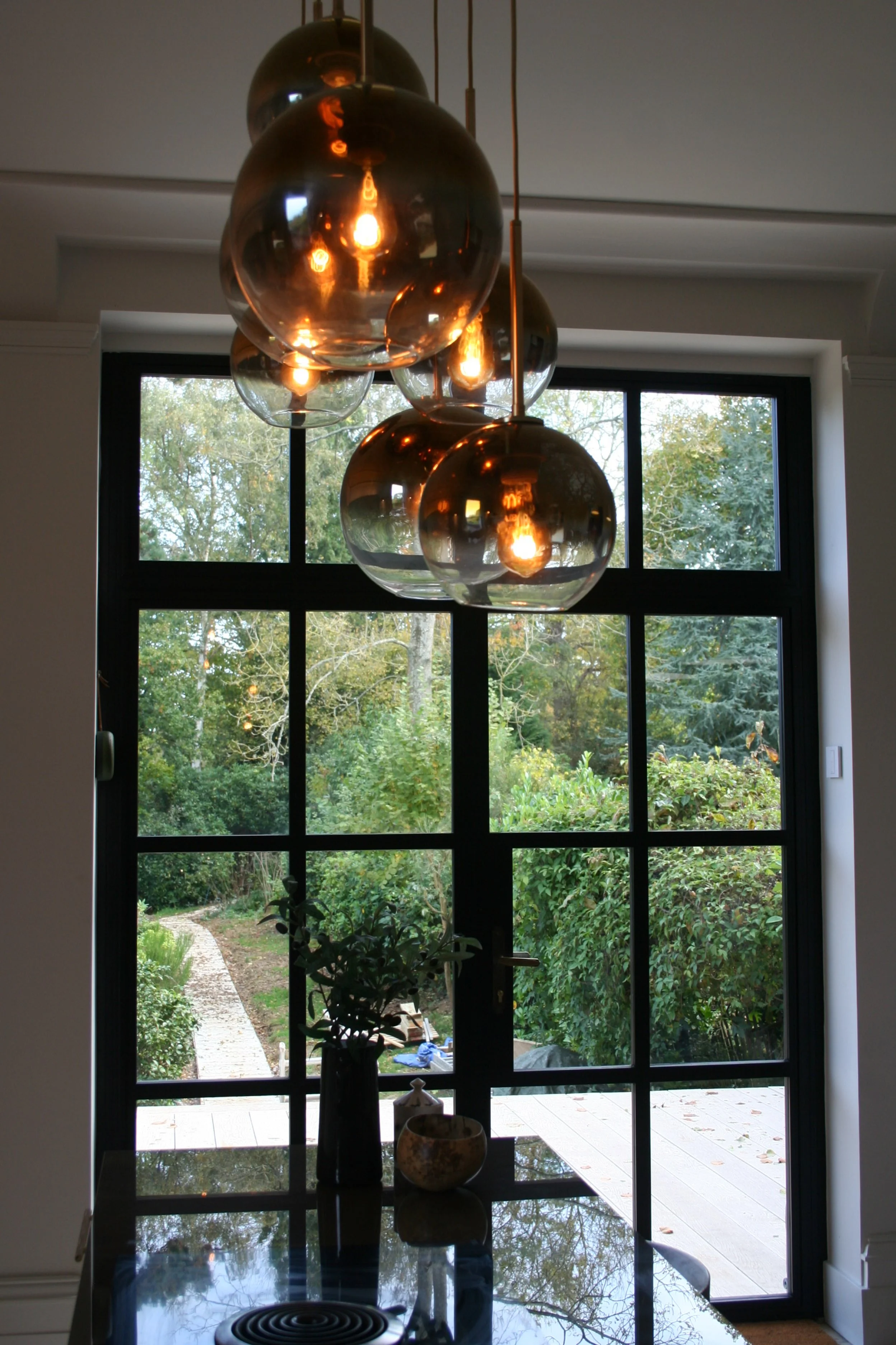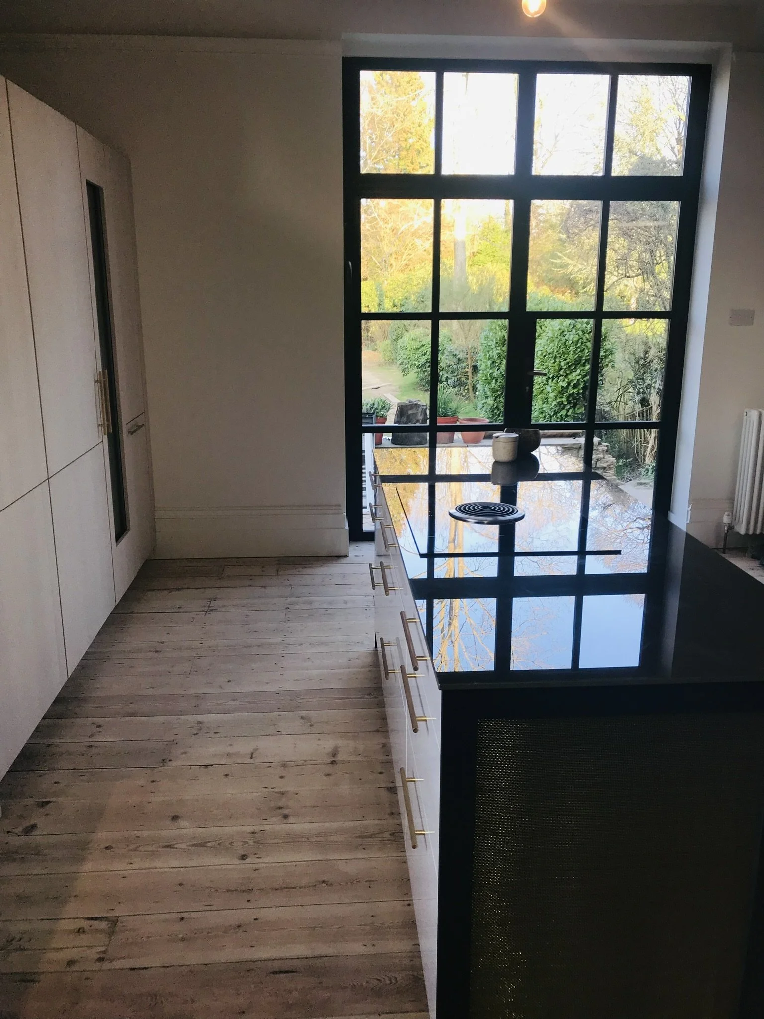 Statement lighting above the island reflects both function and artistry, while Crittall-Styled doors open onto lush garden views, extending the sense of space. Every element is considered and restrained, creating a room that feels quietly confident and beautifully serene.