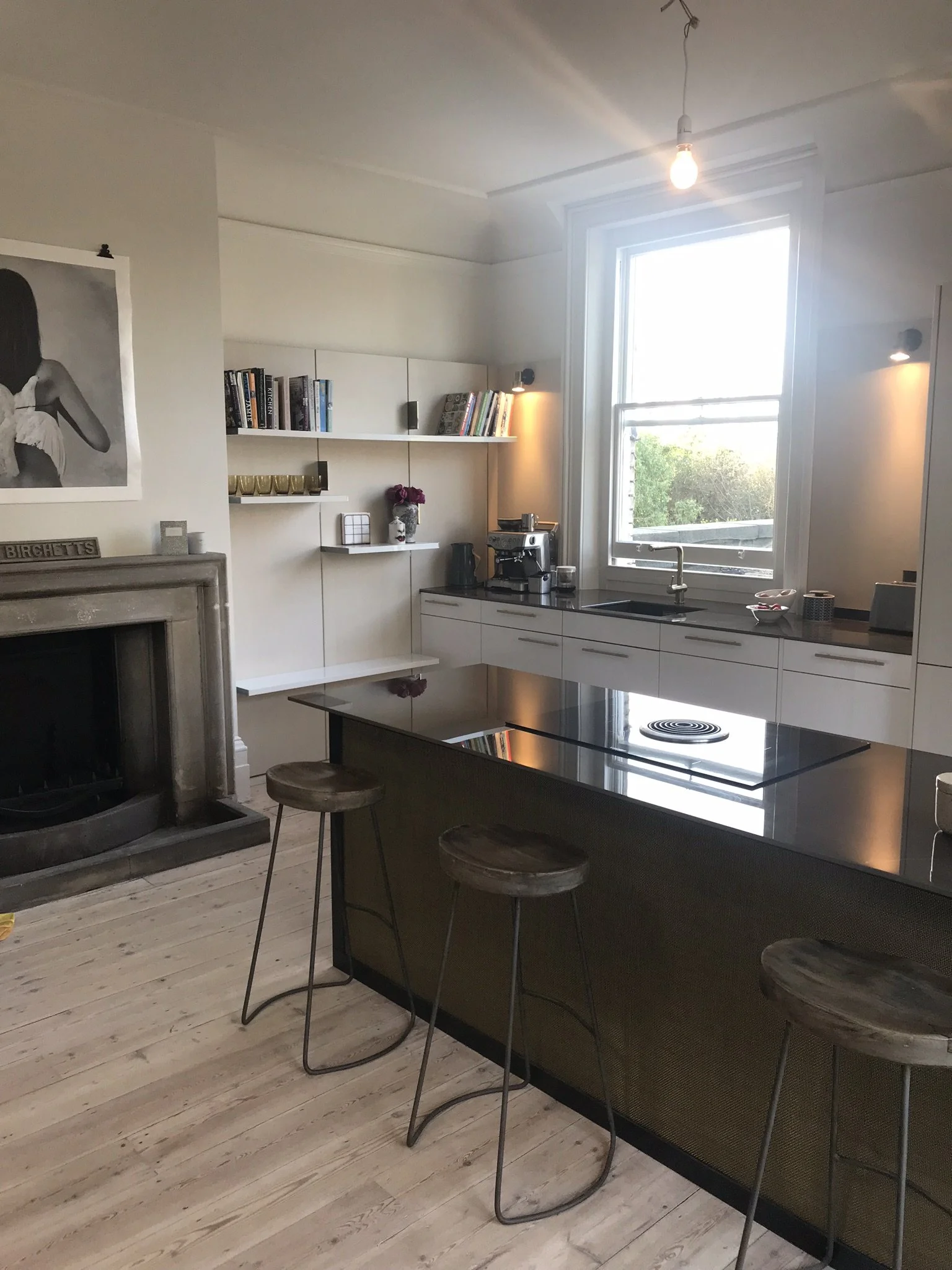Refined and understated, this light-filled space pairs pale timber flooring with sleek white cabinetry and soft, neutral tones for a calm, cohesive atmosphere. The dramatic metal framed island offers contrast and focus, with tactile finishes and floating Oak cool-style stools adding a gentle rustic edge.