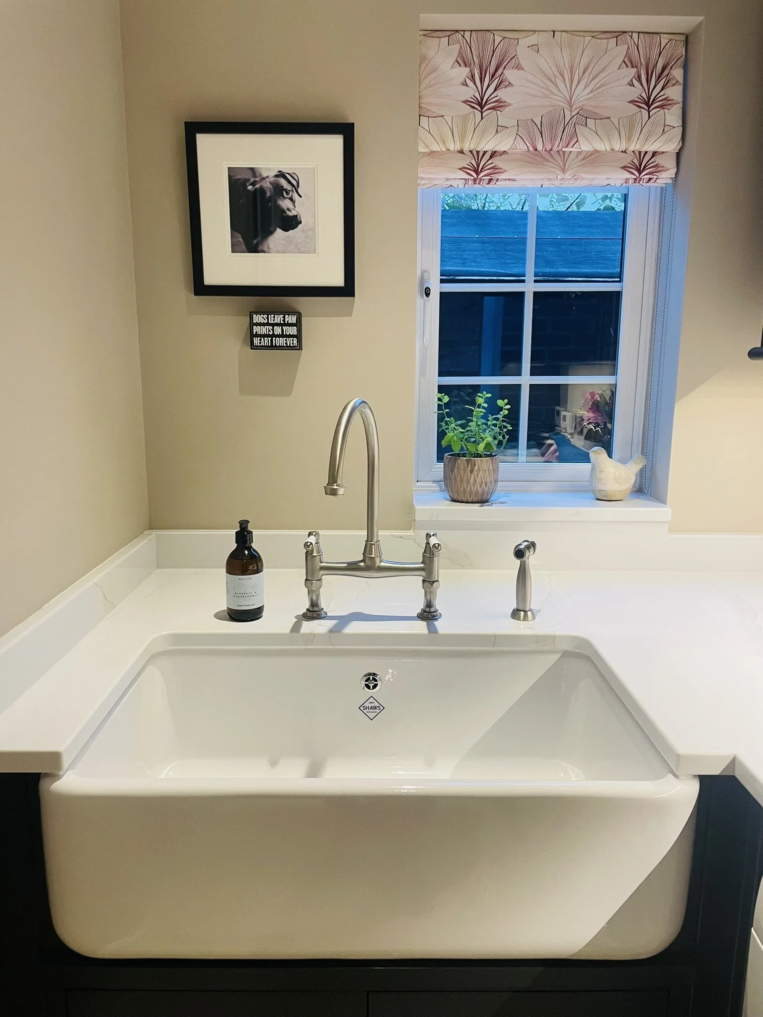 This beautifully renovated utility room blends practicality with timeless style. The deep ceramic sink and sleek white worktops are perfect for everyday chores, while the dark cabinetry adds contrast and sophistication. Integrated appliances keep the design streamlined, and the neutral stone floor provides both elegance and durability. A soft Roman blind adds a gentle pop of colour and charm to the space.