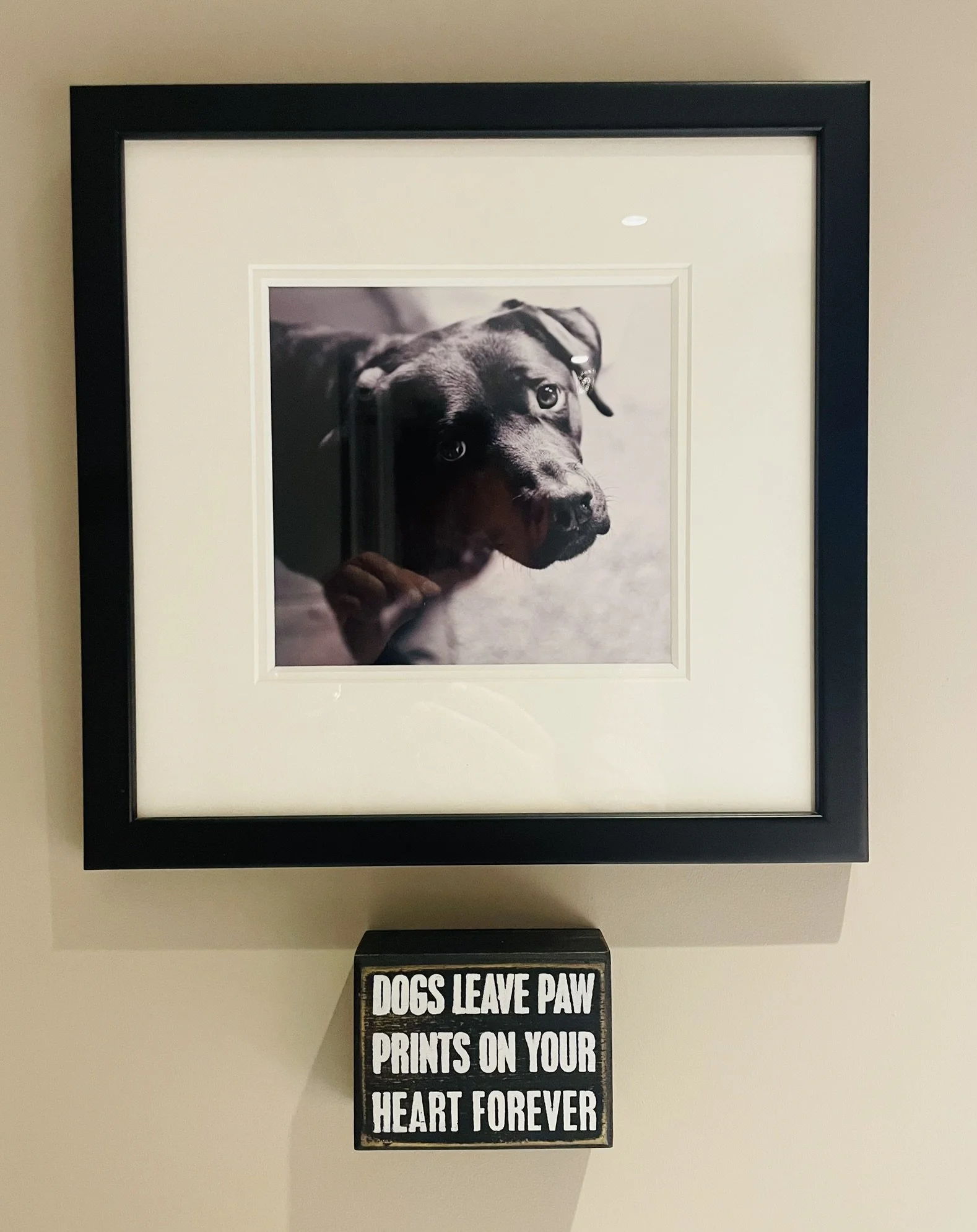 What makes this room truly special is the touching tribute to a much-loved dog. A black-and-white portrait, thoughtfully framed above the sink, captures the dog’s gentle spirit. Below it, a plaque reads, “Dogs leave paw prints on your heart forever,” adding a heartfelt touch.